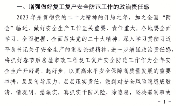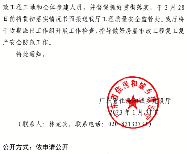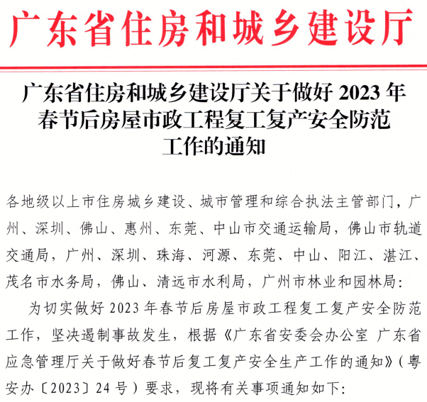 近日,廣東省住建廳發(fā)布《廣東住建廳關(guān)于做好2023年春節(jié)后房屋市政工程復工復產(chǎn)安全防范工作的通知》。