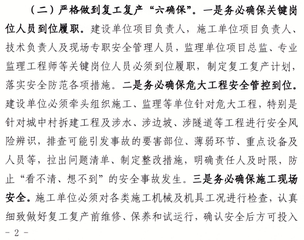 建設(shè)單位項目負責人,施工單位項目負責人、技術(shù)負責人及現(xiàn)場專職安全管理人員,監(jiān)理單位項目總監(jiān)、專業(yè)監(jiān)理工程師等關(guān)鍵崗位人員必須到位履職,制定復工復產(chǎn)計劃,落實安全防范各項措施。