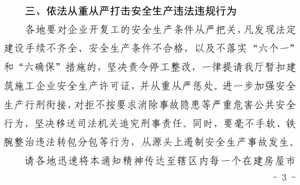各地要對企業(yè)開復工的安全生產(chǎn)條件從嚴把關(guān),凡發(fā)現(xiàn)法定建設(shè)手續(xù)不齊全、安全生產(chǎn)條件不合格,以及不落實“六個一”和“六確保”措施的,堅決責令停工整改,一律提請我廳暫扣建筑施工企業(yè)安全生產(chǎn)許可證,并從重從嚴懲處。